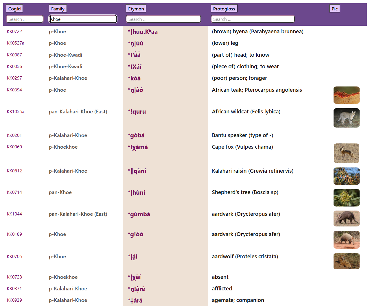 Each column can be filtered by typing in the “Search” box on the top of each column: see the second column in the screenshot. In order to open a cognate set, click on the etymon in the central column (or on the picture if there is one).