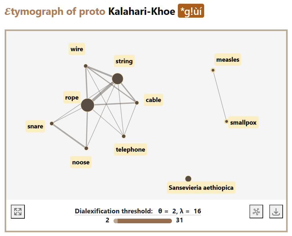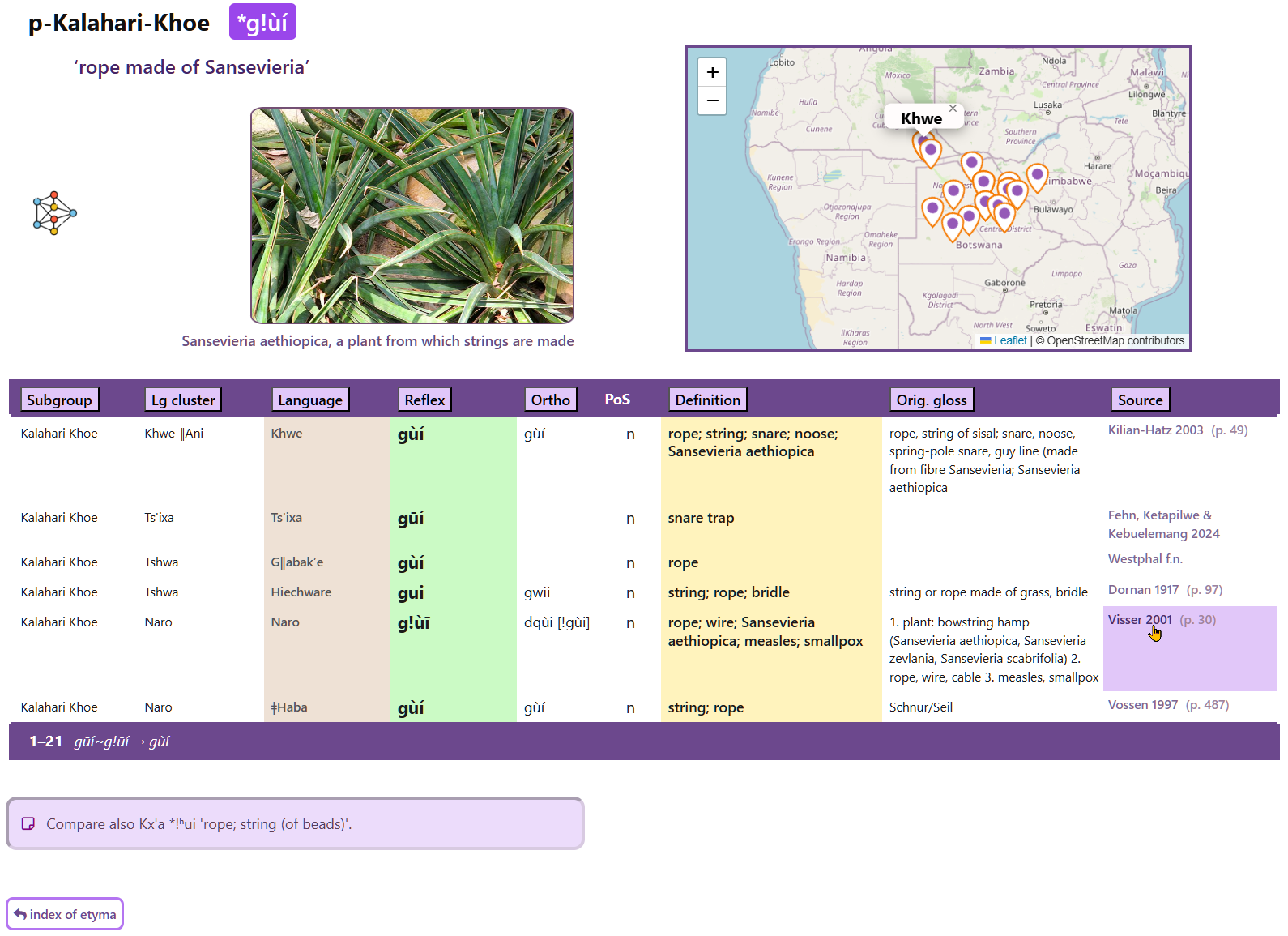 Each individual entry presents a cognate set – i.e. a set of modern forms that historically go back to the same ancestral etymon. As an example of such an entry, consider proto-Kalahari-Khoe *g!ùí ‘rope made of Sansevieria’: